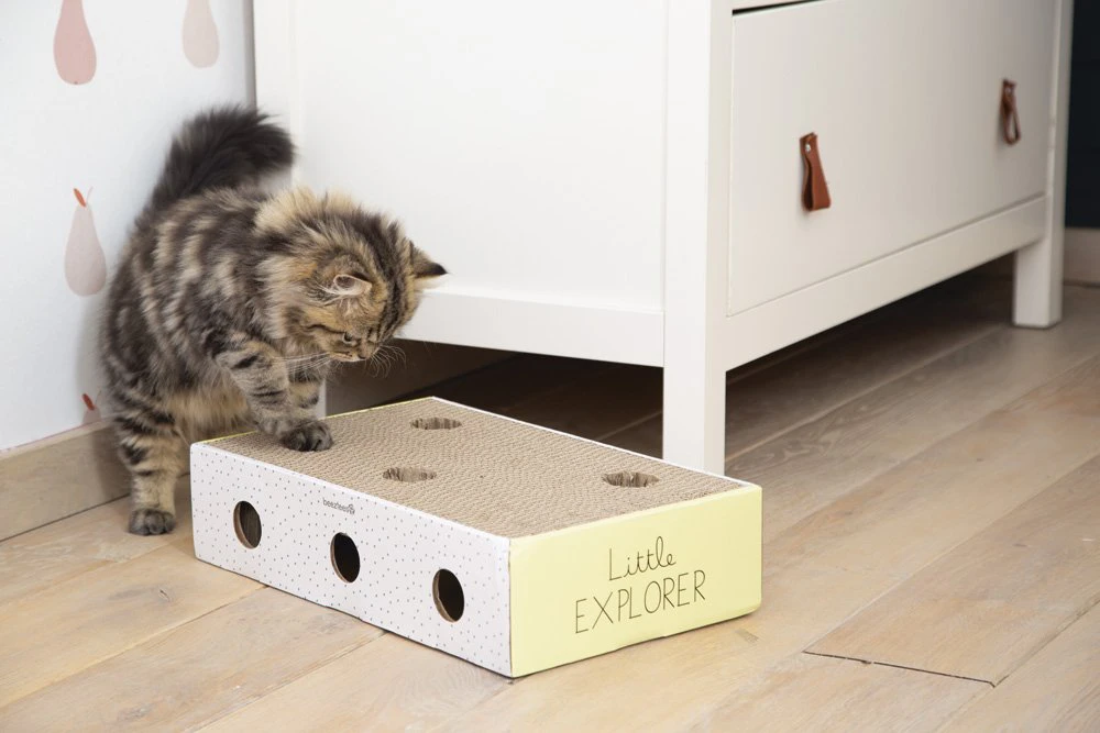 Deze leuke Beeztees Riva Krabbox bevat verschillende elementen. Zoals de naam al doet vermoeden kan het worden gebruikt om te krabben. Deze krabbox is namelijk gemaakt van karton met daarin een plaat krabkarton. Zo kan jouw kitten zich heerlijk uitleven. Daarnaast zitten er ook speelballetjes verwerkt in de box, waardoor jouw kitten leert om deze te zoeken en zo leert hij of zij ook meteen nieuwe geluiden. Tot slot kan de doos ook worden gebruikt als geurgewenningsdoos. Met deze doos kun je jouw kitten laten wennen aan bepaalde geuren in en rondom het huis. Geurobjecten kunnen in de doos worden geplaatst (bijv. blaadjes) zodat jouw kitten spelenderwijs gewend kan raken aan nieuwe geuren.