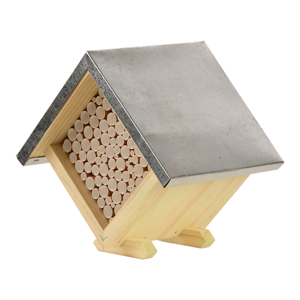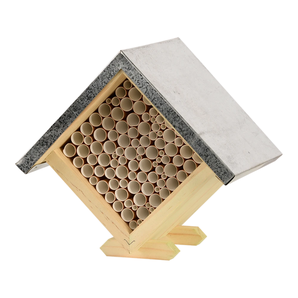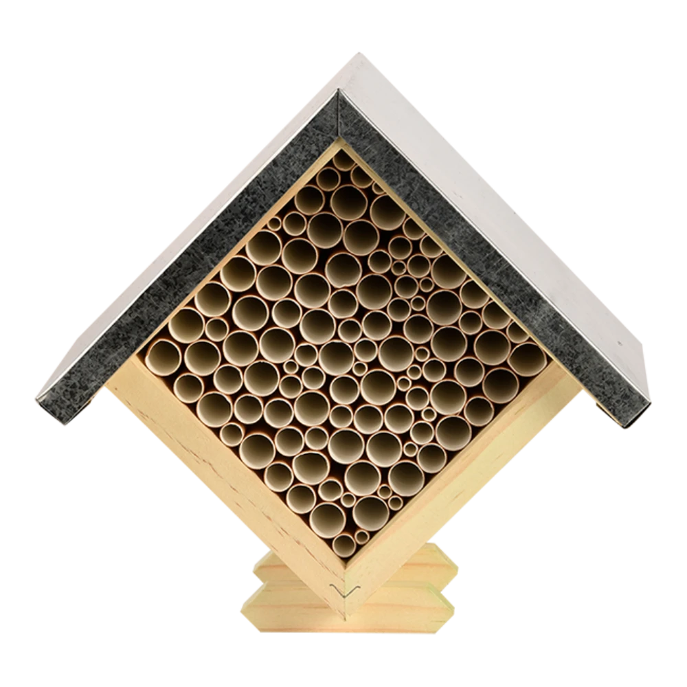 Dit bijenhuis biedt een uitstekende nestgelegenheid voor verschillende soorten bijen. Een vrouwtjesbij maakt in een kartonnen rietje verschillende cellen met daarin een eitje en wat pollen en nectar voor de larf. Hang dit bijenhuis op een zonnige op het zuiden gerichte plek.