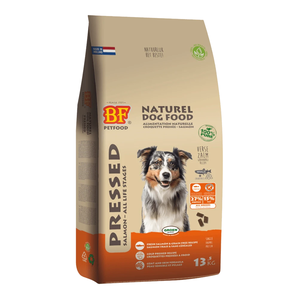Onze natuurlijke BF Petfood® geperst zalm is een hoogwaardige volledige smaakvolle en graanvrije premium hondenvoeding voor elke hond, van pup, adult tot senior. Voor normale, actieve en voedingsgevoelige en kieskeurige honden of moeilijke eters. Met naast verse zalm o.a. ook zalmolie, cranberry en een graanvrije formule. Met effectieve inuline/FOS prebiotica. Hoge acceptatie en licht verteerbaar. Bevat lekker veel Schotse zalm, vers en gedroogd, als enige dierlijke eiwitbron. Lage maagbelasting en verhitting van de brok. Inuline FOS (prebiotica) stimuleert de darmflora en ondersteunt hiermee de gezondheid. Ondersteunt huid en vacht, gebit en een gevoelige spijsvertering. Hondenvoeding die een optimale vertering, ontlasting en conditie van uw hond ondersteunt.