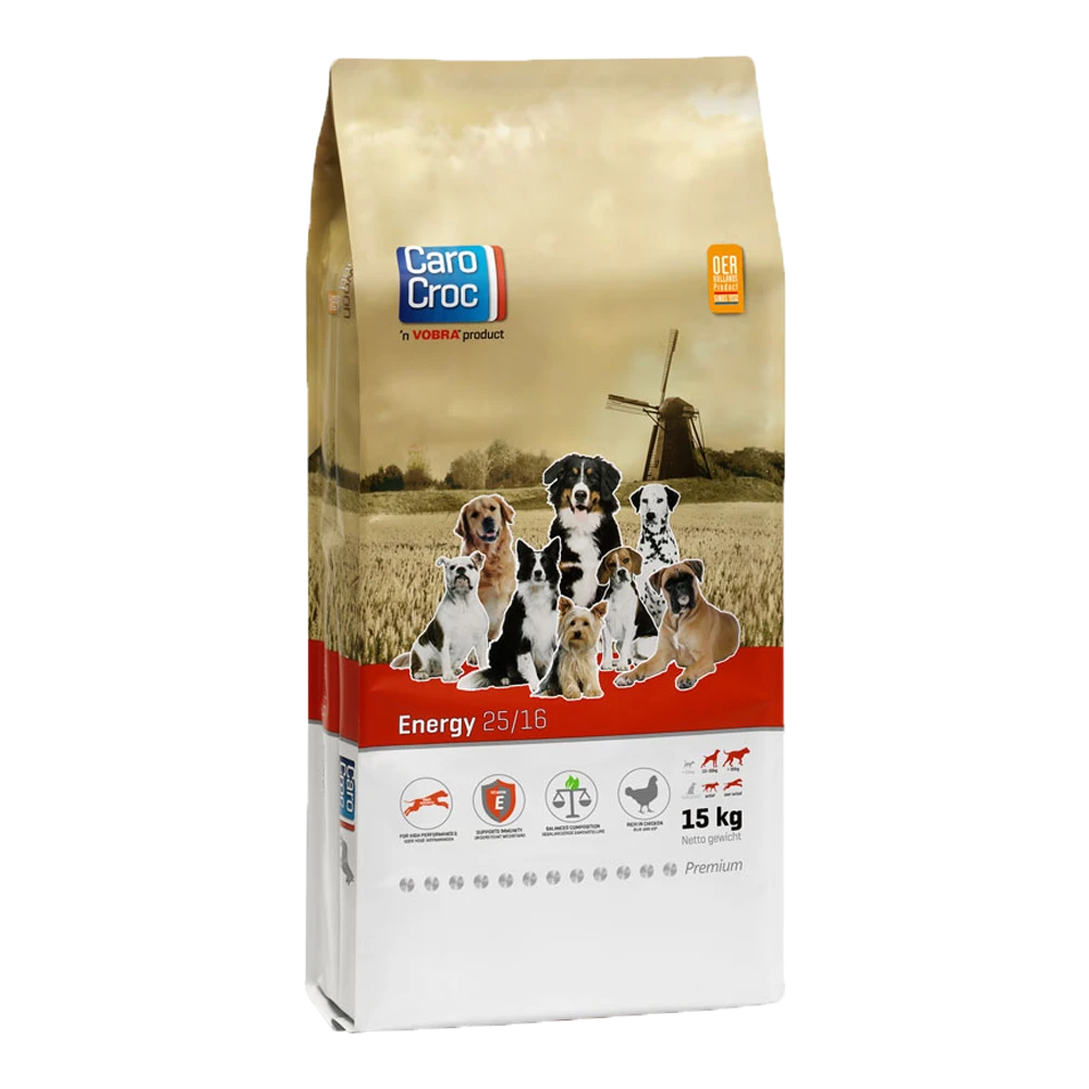Topprestaties verlangen een topconditie. CaroCroc Energy houdt je hond in topconditie bij zware inspanning. Denk bij zware inspanning aan politie-, bewakings-, ren- en sledehonden, drachtige teven (vanaf 42 dagen), zogende teven en dekreuen. CaroCroc Energy bevat 25% eiwit en 16% vet, streng geselecteerde grondstoffen zoals dierlijke eiwitten, vetten en granen, aangevuld met vitaminen, sporenelementen en mineralen, in de juiste verhouding voor het behouden van een topconditie. Daarnaast bevat CaroCroc Energy een optimale omega-3 en -6 vetzuurverhouding.