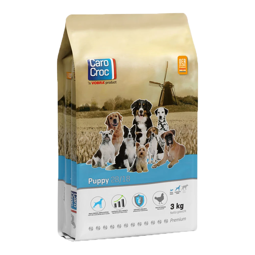 Je pup ontwikkelt zich volop vanaf de geboorte tot 10 maanden voor kleine rassen en tot 15 maanden voor grote rassen. In deze periode wordt het beenderstelsel, het gebit, de spieren en het spijsverteringsstelsel gevormd. Goede voeding is daarom juist in deze fase cruciaal. Voor kleine rassen vanaf 4 weken t/m 10 maanden en voor middelgrote rassen t/m 4 maanden adviseren we om te starten met CaroCroc Puppy. Oudere pups van middelgrote rassen kunnen vanaf 5 maanden overschakelen naar CaroCroc Puppy Large. Pups van grote rassen kunnen vanaf 4 weken direct beginnen met CaroCroc Puppy Large. De optimale verhouding omega-3 en -6 vetzuren van CaroCroc Puppy stimuleert een gezonde huid- en vachtconditie. Daarnaast bevat CaroCroc Puppy gist. Gist ondersteunt in combinatie met vitamine E de Immuunsysteem van je pup. CaroCroc Puppy is goed verteerbaar. Door de uitgebalanceerde samenstelling ontwikkelt je pup zich optimaal en legt daarmee een stevige basis voor een gezond en vitaal hondenleven. Voedingsadvies: voer je pup vanaf de vierde levensweek bij met CaroCroc Puppy. Door de brokjes in het begin vochtig te maken met lauw water, stimuleert u de opname. Eet je pup goed, verstrek de puppybrokjes dan droog. Voer je pup minimaal 2x daags. Het onderstaande voedingsschema vormt de leidraad voor de dagelijkse voergift. Heeft je pup het voer na ongeveer 15 minuten niet op, verwijder dan het restant.