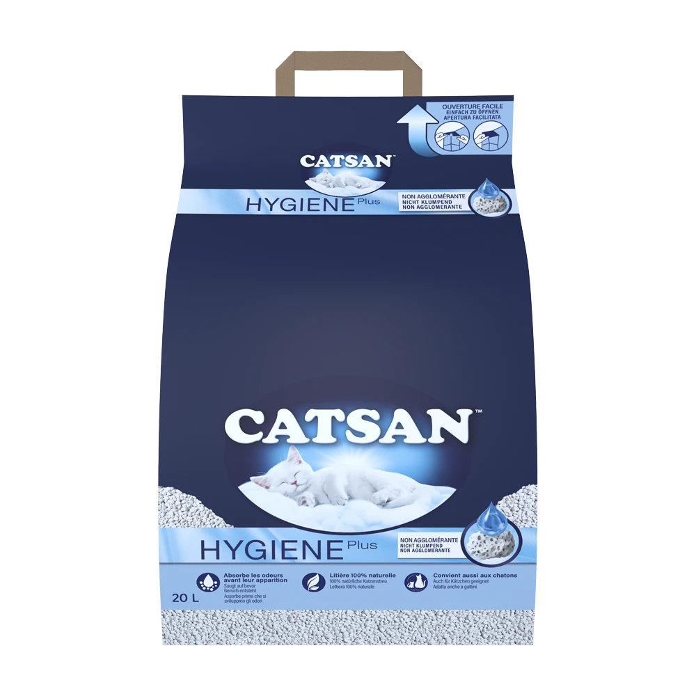 – CATSAN® hygiene plus bestaat uit fijne mineraalkorrels vervaardigd uit kalk en kwartszand die het vocht absorberen als een spons. Deze unieke mineraalkorrels voorkomen de vorming van geurtjes effectiever dan standaard kattenbakvullingen.