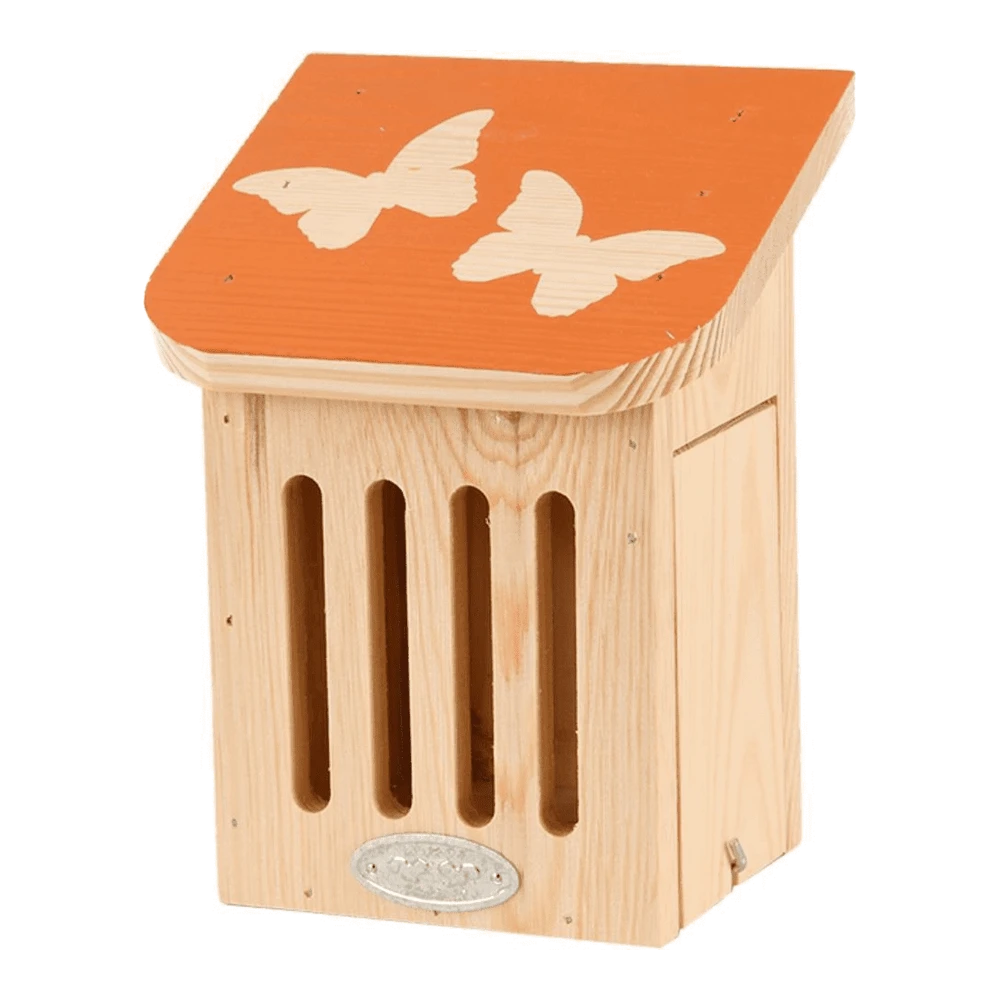 Op een mooie warme en zonnige zomerdag zie je overal vlinders vliegen. Op koude en natte dagen houden ze zich liever schuil. Deze kast biedt vlinders een ideale schuilplaats om bij slecht weer in weg te kruipen. Daarnaast gebruiken vlinders de kast om in te overwinteren. Om het de vlinders helemaal naar de zin te maken, kun je een handvol twijgen in de kast plaatsen zodat de vlinders daaraan kunnen hangen als zij van de kast gebruik maken.