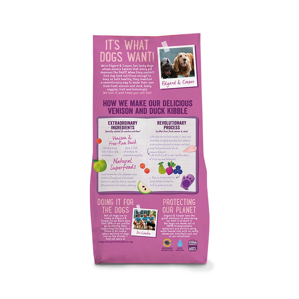 | Beschrijving samenstelling | Samenstelling: verse eend 35%, bataten, erwten, erwteneiwit, vers hert 5%, visolie, eendensaus, lijnzaad, mineralen, mannan-oligosachariden, fructo-oligosachariden, appels 0,04%, rode bieten 0,04%, peer 0,04%, bosbessen 0,04%, vossenbessen 0,04%, goudsbloemblaadjes, brandnetel, braambesblaadjes, venkel, karwij, kamille, melisse |
