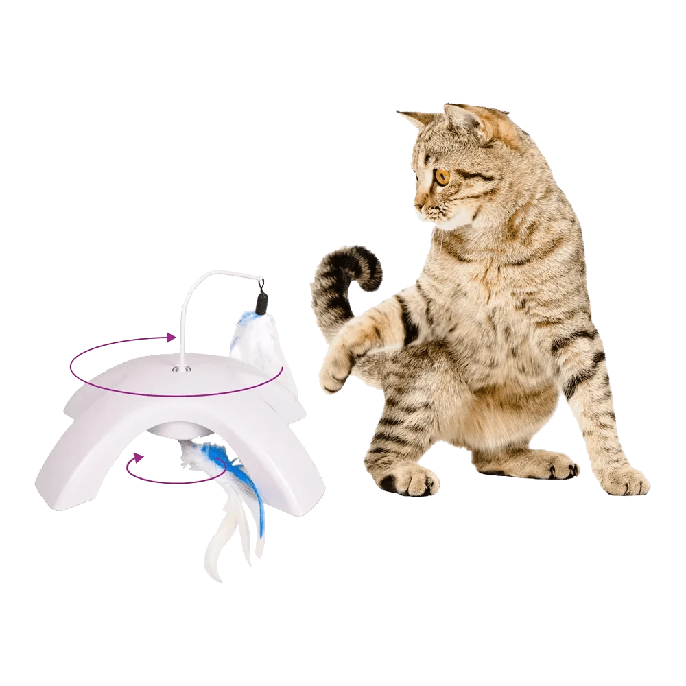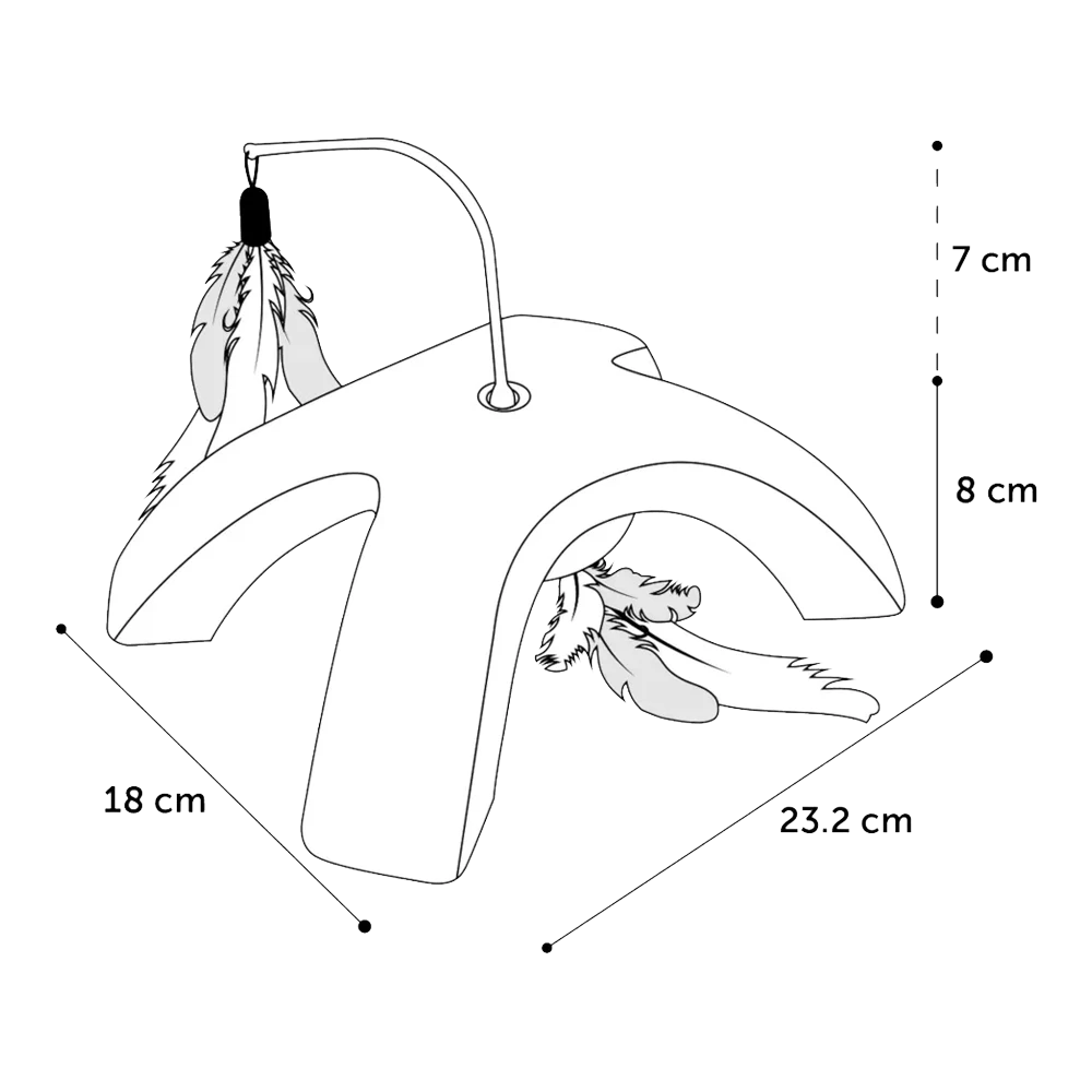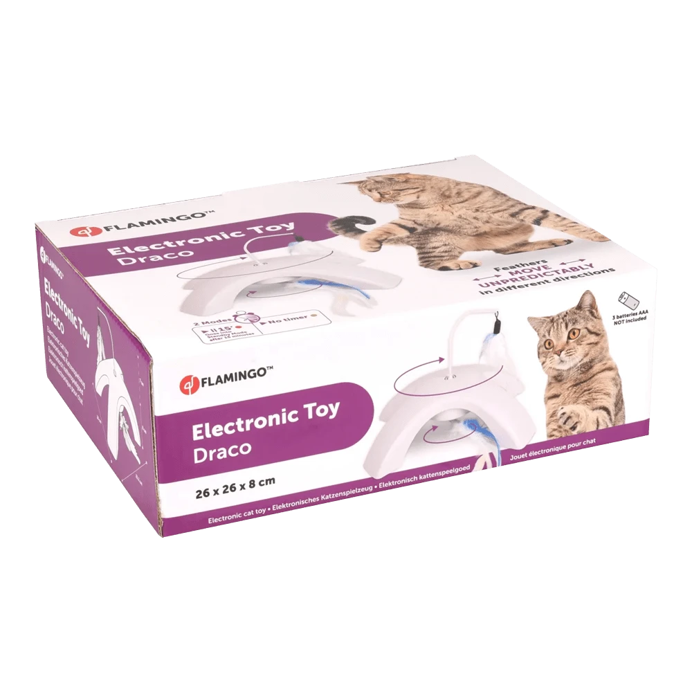 Zoek je een kattenspeeltje voor je kat? Dan is dit een leuk speeltje! De roterende veren stimuleren het spelen van je kat. De Draco veren wordt geleverd met de bijbehorende veren. Om de veren te laten roteren heb je 3 AAA-baterijen nodig, welke niet worden meegeleverd. Je kat zal uren lang speelplezier hebben met dit speeltje.