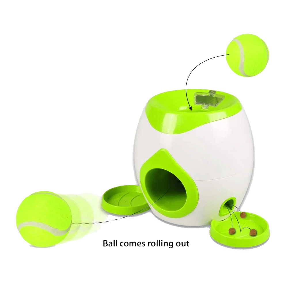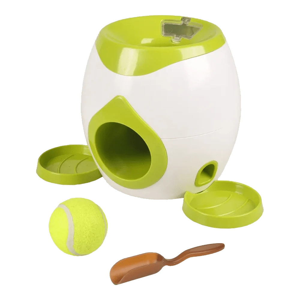 Zoek je hondenspeelgoed voor je hond die tennisballen weg schiet? Dan is deze interactieve tennisballen schieter het perfecte hondenspeeltje. De tennisballen worden weggeschoten, zodat je hond de bal kan halen. Vervolgens dient je hond de tennisbal terug in het apparaat te stoppen en wordt hij beloond met snacks van maximaal 12mm doorsnede. Dit hondenspeeltje zorgt voor uren lang speelplezier bij je hond. Bij de tennisballen schieter worden automatisch tennisballen meegeleverd.