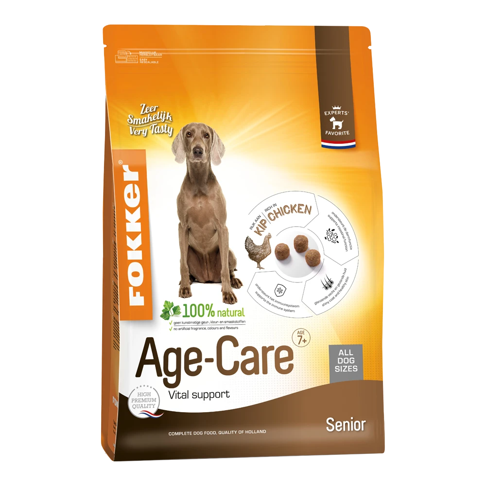 Fokker Age-Care is een high premium hondenvoeding, speciaal samengesteld voor de oudere hond (vanaf 7-9 jaar). De op deze levensfase afgestemde hoogwaardige ingrediënten, zorgen ervoor dat uw hond voortdurend fit en gezond blijft. Fokker Age-Care draagt bij aan het voorkomen van overgewicht en bevat (Noorse) zalmolie, wat een blijvend glanzende vacht ondersteunt. De toevoeging van chondroïtine en glucosamine draagt positief bij aan de bescherming van kraakbeen en gewrichten. Door de hoge smakelijkheid eet uw hond Fokker Age-Care met plezier.
