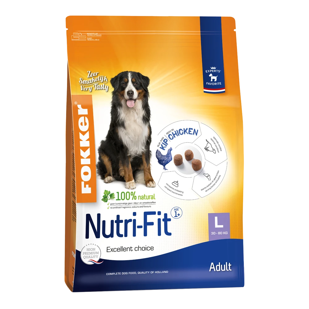 Fokker Nutri-Fit L is high premium hondenvoeding voor volwassen honden van grote tot zeer grote rassen met een gewicht van 30-80 kg. Fokker Nutri-Fit L bevat Noorse zalmolie wat een gezonde huid en een blijvend glanzende vacht ondersteunt. Door de hoge verteerbaarheid is het niet nodig grote hoeveelheden te voeren. Dit zorgt voor een compacte ontlasting en helpt het gevreesde maag kantelen bij de hond te voorkomen. Gewrichten en botten krijgen het bij grote rassen zwaar te verduren en vereisen een specifieke ondersteuning. Fokker Nuti-Fit L draagt hiertoe bij, doordat het een optimale verhouding aan calcium en fosfor bevat. De toevoeging van chondroïtine en glucosamine ondersteunt tevens de bescherming van het kraakbeen. Door de hoge smakelijkheid eet uw hond Fokker Nutri-Fit L met plezier.