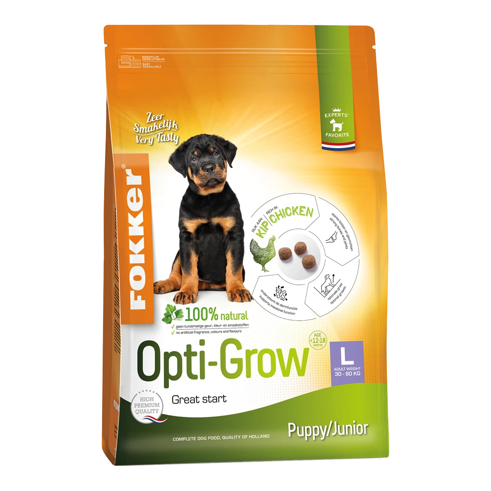 Fokker Opti-Grow L is een high premium hondenvoeding voor jonge honden van grote tot zeer grote rassen met een volwassen gewicht van 30 tot 80 kg. De uitgekiende selectie van ingrediënten staat garant voor een gelijkmatige groei van het skelet, wat groeipijnen kan voorkomen. Daarnaast is de ontwikkeling van sterke spieren de zekerheid voor een energieke en speelse pup. Noorse zalmolie ondersteunt een gezonde huid en een blijvend glanzende vacht. Geef Opti-Grow L zeker tot de leeftijd van 12 maanden. Grotere rassen mag u de brokjes zelfs tot 18 maanden verstrekken (zie voedingstabel). Door de hoge smakelijkheid eet uw hond Fokker Opti-Grow L met veel plezier.