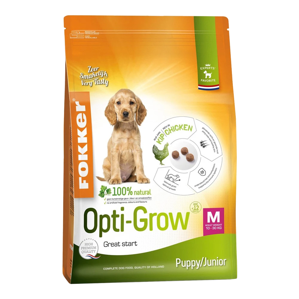 Fokker Opti-Grow M is een high premium hondenvoeding voor jonge honden van middelgrote rassen met een volwassen gewicht van 10 tot 30 kg. De uitgekiende selectie van ingrediënten staat garant voor een gelijkmatige groei. De ontwikkeling van gezonde botten en sterke spieren is de zekerheid voor een energieke en speelse pup. Noorse zalmolie ondersteunt een gezonde huid en een blijvend glanzende vacht. Tot de leeftijd van 12 maanden is dit product de perfecte start voor uw hond. Schakel daarna over op Fokker Nutri-Fit M voor een geweldig leven (zie voedingstabel). Door de hoge smakelijkheid eet uw hond Fokker Opti-Grow M met veel plezier.