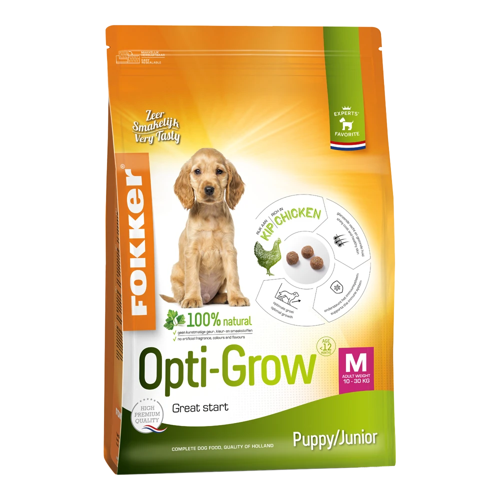 Fokker Opti-Grow M is een high premium hondenvoeding voor jonge honden van middelgrote rassen met een volwassen gewicht van 10 tot 30 kg. De uitgekiende selectie van ingrediënten staat garant voor een gelijkmatige groei. De ontwikkeling van gezonde botten en sterke spieren is de zekerheid voor een energieke en speelse pup. Noorse zalmolie ondersteunt een gezonde huid en een blijvend glanzende vacht. Tot de leeftijd van 12 maanden is dit product de perfecte start voor uw hond. Schakel daarna over op Fokker Nutri-Fit M voor een geweldig leven (zie voedingstabel). Door de hoge smakelijkheid eet uw hond Fokker Opti-Grow M met veel plezier.