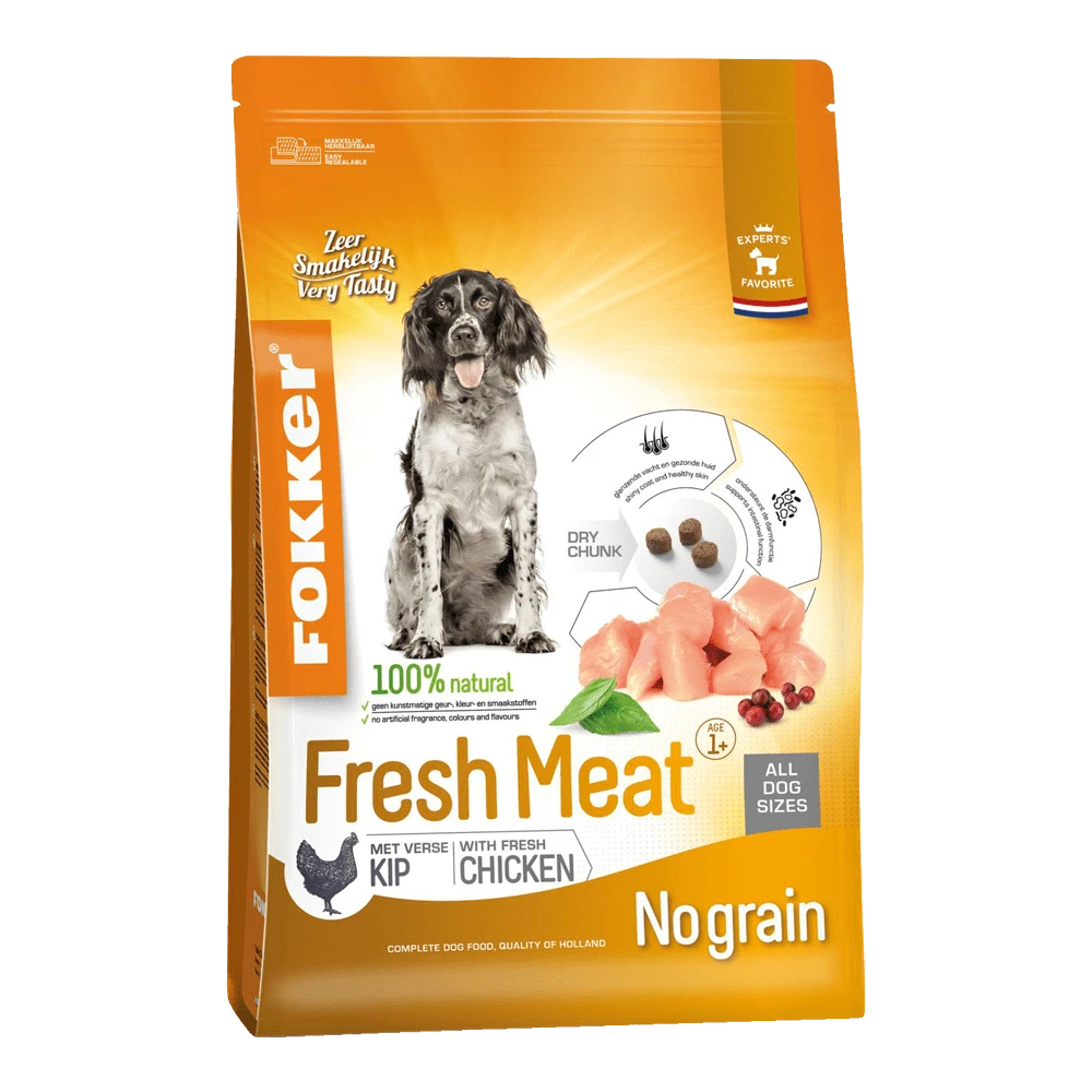 Sommige honden reageren beter op een graanvrije voeding en een voeding met veel vers vlees. +Fresh Meat van Fokker is een premium brokvoeding geschikt voor volwassen honden die beter gedijen op een graanvrije brok.