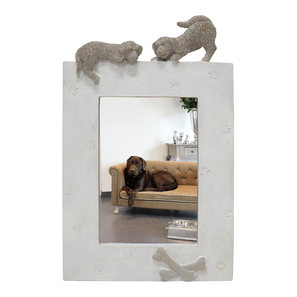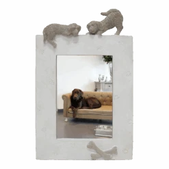 Jouw mooiste herinneringen aan je viervoeter verdienen een mooi plekje op je dressoir, je bijzettafel of aan je muur. Leuk zijn de details zoals de twee 3D hondjes aan de bovenkant van het lijstje, de botjes aan de onderzijde en de ietswat dieper liggende pootafdrukken verspreid over de rand van het fotolijstje. Fantastisch te combineren met het fotolijstje in liggend model. Ook verkrijgbaar in kat versie.