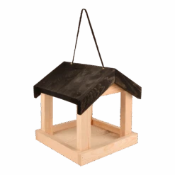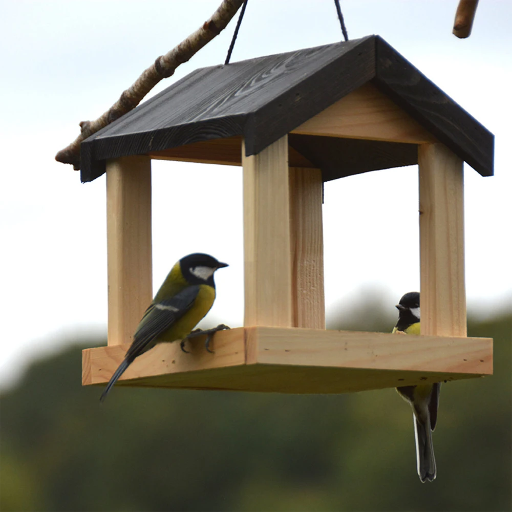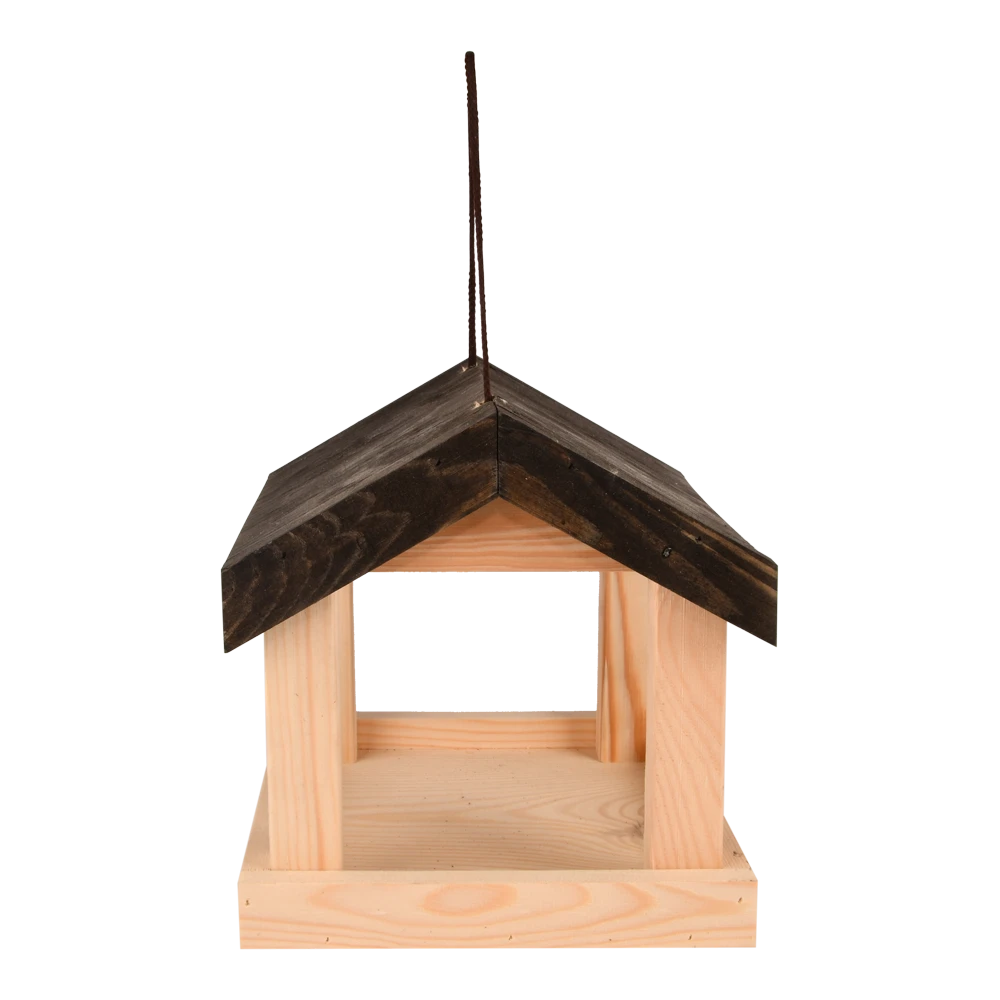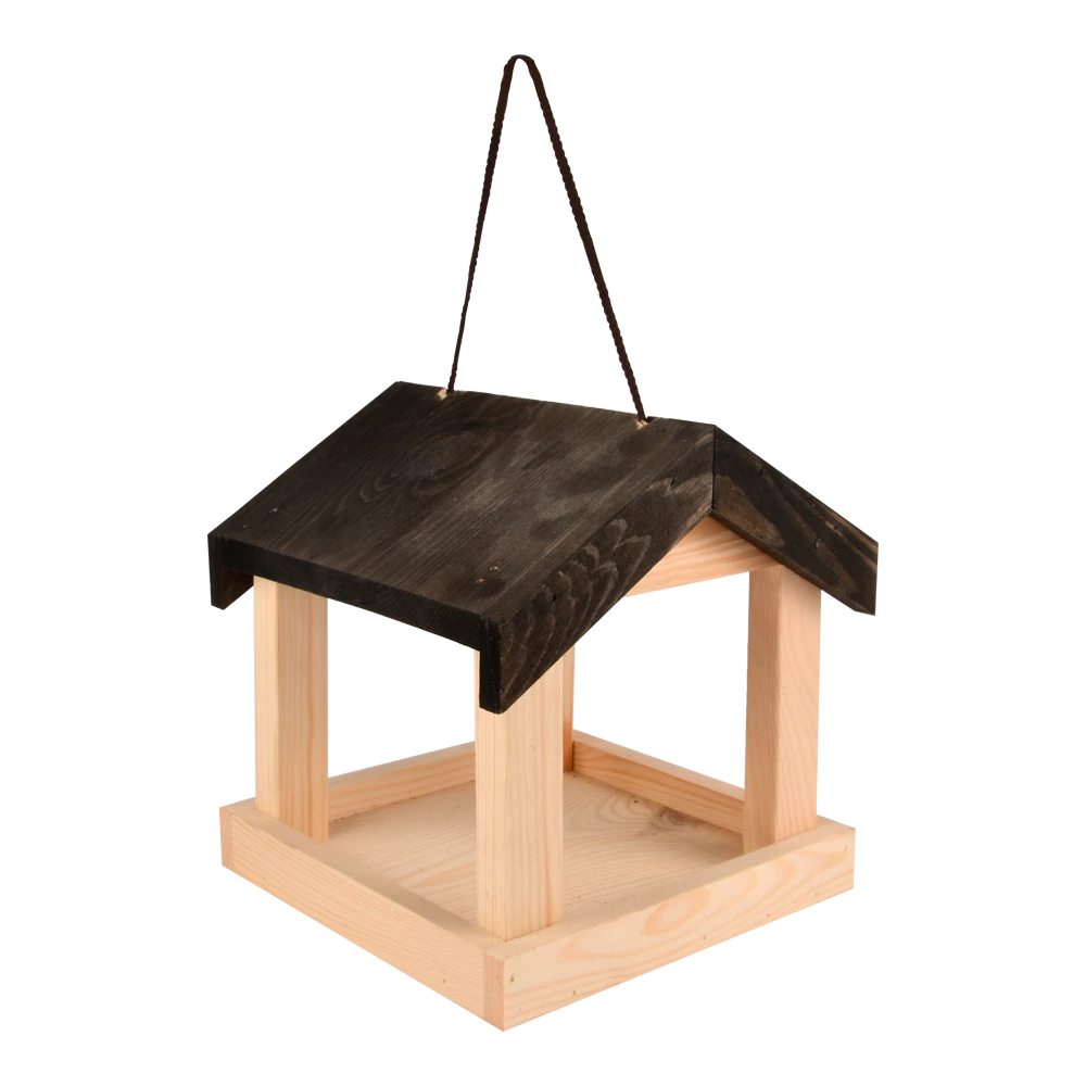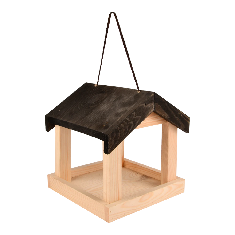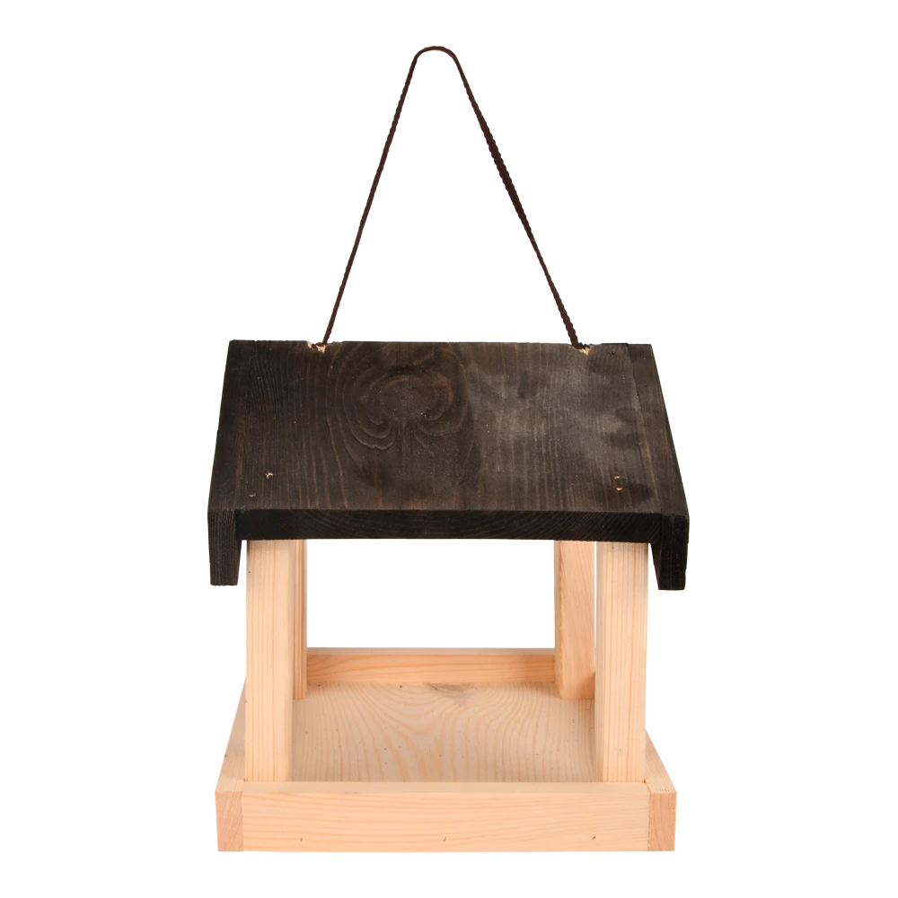 Verwen de vogels in de tuin met dit strak vormgegeven voederhuis. Het voederhuis heeft een zwart dak en is voorzien van een ophangkoord.