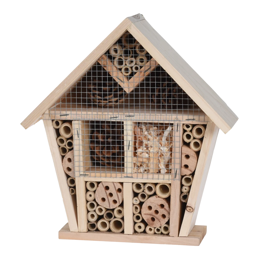 Insecten vervullen veel taken in onze tuinen. Zij bestuiven planten en fungeren als natuurlijke ongediertebestrijders en zijn zo een belangrijk onderdeel van ecologisch tuinieren. Dit insectenhotel biedt erschillende soorten insecten tegelijkertijd de kans om te nestelen en te overwinteren. De natuurlijke woonplaats van vele insectensoorten wordt door veranderingen in hun leefgebied bedreigd en dit is de manier om ze te helpen en te beschermen. Het rode compartiment biedt bescherming en huisvesting aan groene gaasvliegen, lieveheersbeestjes en oorwormen, allemaal echte ongediertebestrijders. Zij eten bladluizen en spinmijten. Vul het compartiment met fijn tarwestro zodat deze insecten kunnen overwinteren. Bijen verschuilen zich vaak in holle rietjes waarbij iedere soort een voorkeur heeft voor een ander formaat. Het is aan te raden de bamboe rietjes schoon te maken met het bijgeleverde borsteltje voordat het insectenhotel wordt opgehangen. Bijen houden van “strakke” gangen.