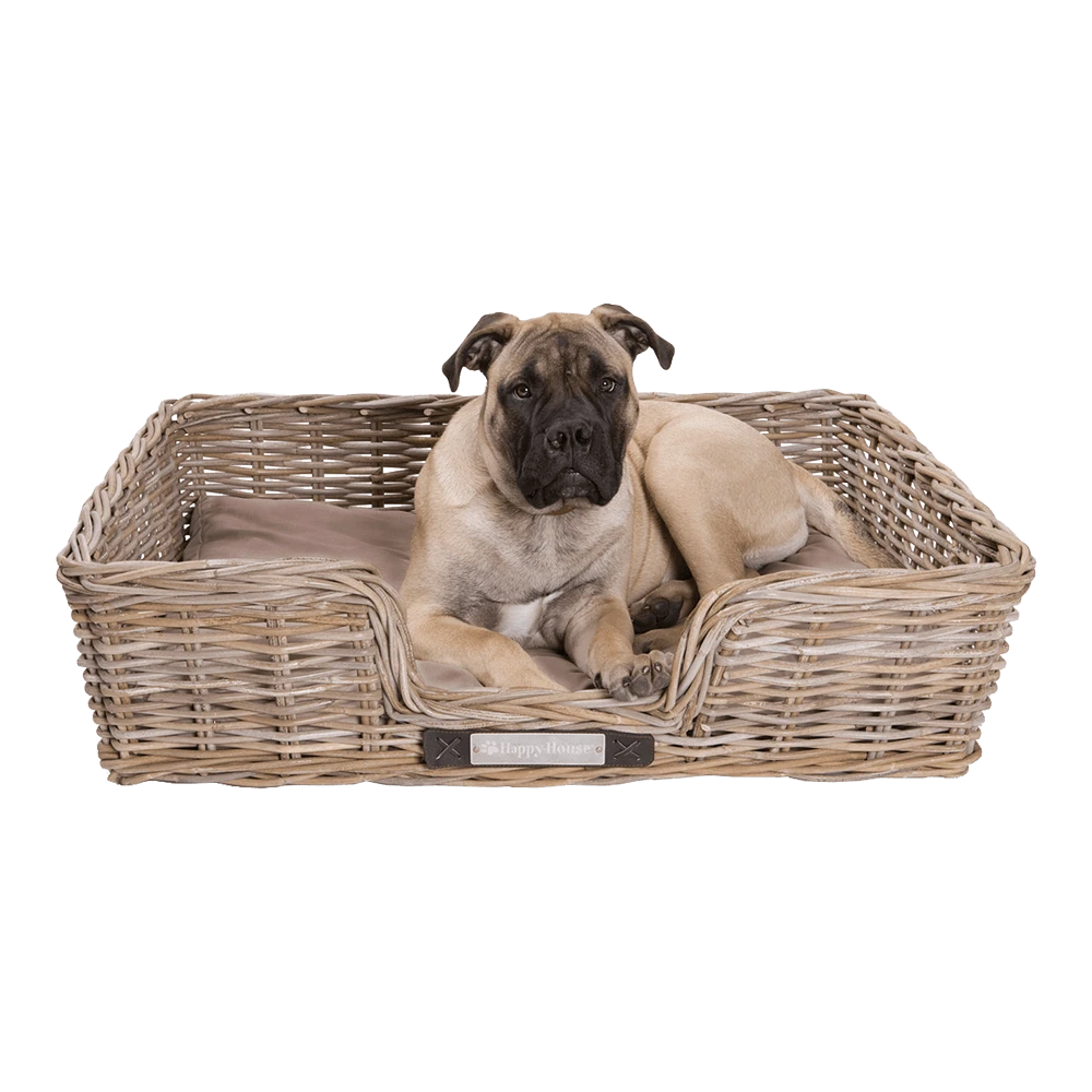Populair zijn de rechthoekige rieten manden van Happy-House. Een tijdloze mand die in elk interieur mooi zal staan. In deze rieten mand kan je viervoeter heerlijk liggen. Het mandje wordt geleverd met een taupe kleurig kussen, de hoes is wasbaar op 30 graden. Verkrijgbaar in 5 verschillende maten. Riet is een natuurproduct, al onze rieten producten worden met de hand gevlochten in Indonesië, hierdoor kunnen kleine kleur- en afwerkingsverschillen ontstaan, ook in gelijke items. Meer informatie vindt u onder ‘materiaal eigenschappen’.