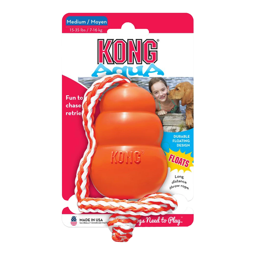 De KONG Aqua is een drijvend apporteerspeeltje dat, zowel in als buiten het water, veel plezier en lichaamsbeweging geeft. De KONG Aqua heeft een kern van schuimrubber die blijft drijven terwijl de hond er naartoe zwemt om hem op te halen.