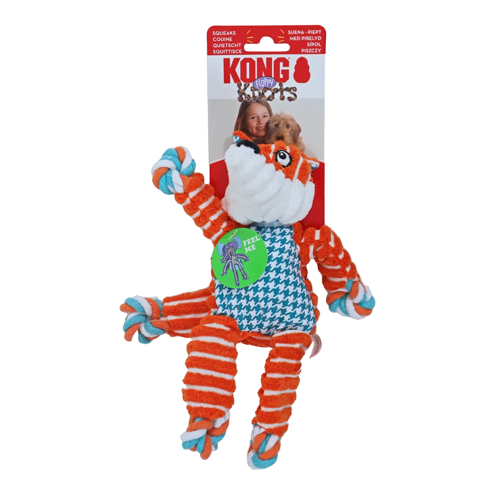 KONG Floppy Knots zijn de nieuwste in de serie van de knopen met een vrolijk, grof ontwerp voor groot pak plezier. Het realistische gevoel van het ingesloten geknoopte touw voldoet aan natuurlijke instincten terwijl de gevarieerde texturen en piepertjes extra aanzetten tot spelen. Maak je klaar voor onderhoudende spelletjes en plezier, speeltje is zonder vulling voor minder rotzooi.