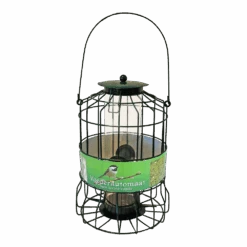 Metalen voederautomaat groen voor kleine vogels is een voersilo waar vetvoer of strooivoer in kan voor buitenvogels. De voersilo heeft een beschermende draadbol om zich heen en biedt daarmee een veilige voerplek aan voor de kleine buitenvogels. Grote vogels kunnen er niet bij door de kleine mazen. De metalen pindahouder is gemakkelijk schoon te maken en het ergonomische design zorgt voor een natuurlijk houding tijdens het eten. Door deze voersilo geniet je van etende vogels in uw tuin of balkon die niet weggejaagd zullen worden door grote vogels. Afmeting: 24×17 cm.