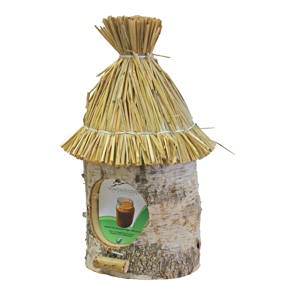 Pindakaaspot houder berken met stro dak. Een pot vogelpindakaas voor buitenvogels kan u heel gemakkelijk ophangen met deze berken pindakaaspothouder. Deze pindakaaspothouder is verkrijgbaar met een berken, tenen of stro dak. Hang de pindakaaspothouder aan een muur, boom of schutting en schuif een pot pindakaas voor vogels (zonder deksel) in de berken houder. Zo creëert u een drukbezochte voederplaats voor veel kleurrijke buitenvogels.