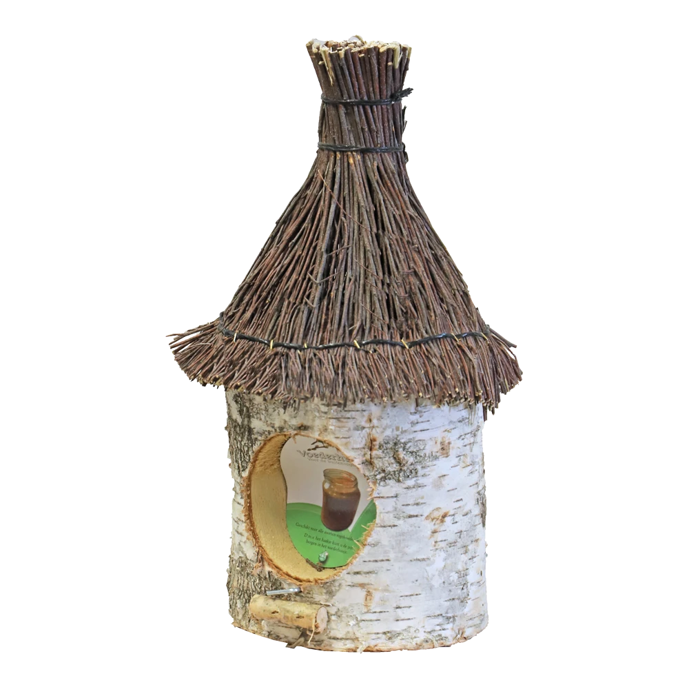 Pindakaaspot houder berken met tenen dak. Een pot vogelpindakaas voor buitenvogels kan u heel gemakkelijk ophangen met deze berken pindakaaspothouder. Deze pindakaaspothouder is verkrijgbaar met een berken, tenen of stro dak. Hang de pindakaaspothouder aan een muur, boom of schutting en schuif een pot pindakaas voor vogels (zonder deksel) in de berken houder. Zo creëert u een drukbezochte voederplaats voor veel kleurrijke buitenvogels.