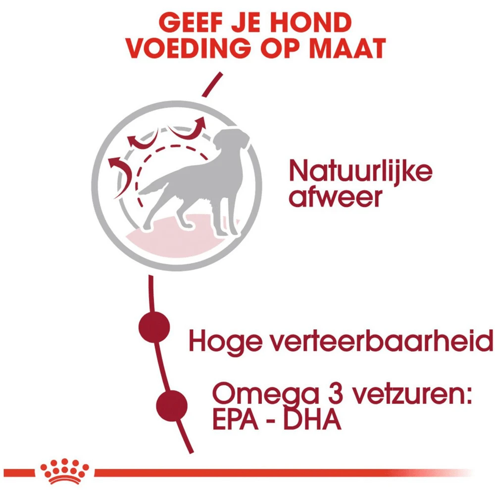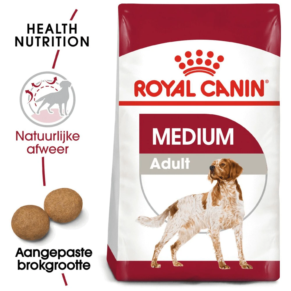 Op een leeftijd van één jaar heeft je middelgrote hond lichamelijk de volwassenheid bereikt. Goede voeding met de juiste voedingsstoffen in de juiste hoeveelheden is ook in deze fase van zijn leven essentieel en ondersteunt een goede gezondheid. ROYAL CANIN® Medium Adult is samengesteld met de voedingsbehoeften van je middelgrote hond in het achterhoofd en is geschikt voor honden met een leeftijd tussen de 1 en 7 jaar, en een volwassen gewicht tussen de 11 en 25 kilogram. ROYAL CANIN® Medium Adult bevat een exclusief antioxidantencomplex dat, net als voedingsstoffen zoals manno-oligo-sacchariden, de natuurlijke Immuunsysteemvan je hond ondersteunt. ROYAL CANIN® Medium Adult bevordert de optimale Spijsvertering dankzij een exclusieve formule met hoogkwalitatieve eiwitten en uitgebalanceerde voedingsvezels. Daarnaast is ROYAL CANIN® Medium Adult verrijkt met omega 3 vetzuren (EPA-DHA) wat helpt een gezonde huid te behouden.