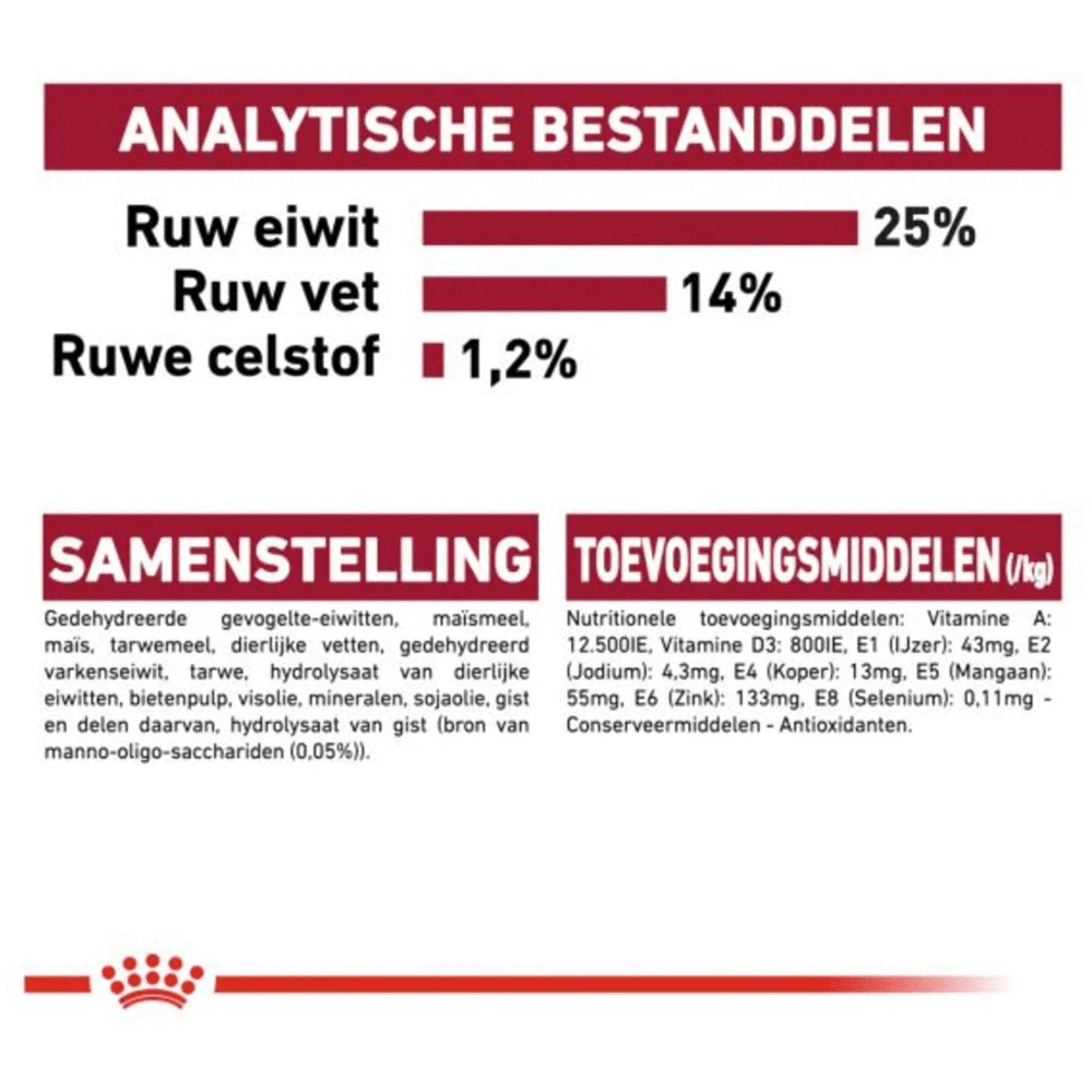 | Beschrijving samenstelling | Samenstelling: gedehydreerde gevogelte-eiwitten, maïsmeel, maïs, tarwemeel, dierlijke vetten, gedehydreerd varkenseiwit, tarwe, hydrolysaat van dierlijke eiwitten, bietenpulp, visolie, sojaolie, gist, mineralen, hydrolysaat van gist (bron van Manno-Oligo-Sacchariden) |