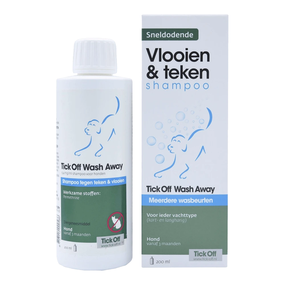 Tick Off Wash Away is een vlooien- en tekenshampoo voor honden. Doordat er in de shampoo de werkzame stof Permethrin zit, doodt het direct alle aanwezige vlooien en teken. De teken- en vlooienshampoo heeft een korte werkingsduur en is daardoor enkel geschikt voor de bestrijding van aanwezige teken en/of een vlooienbesmetting.