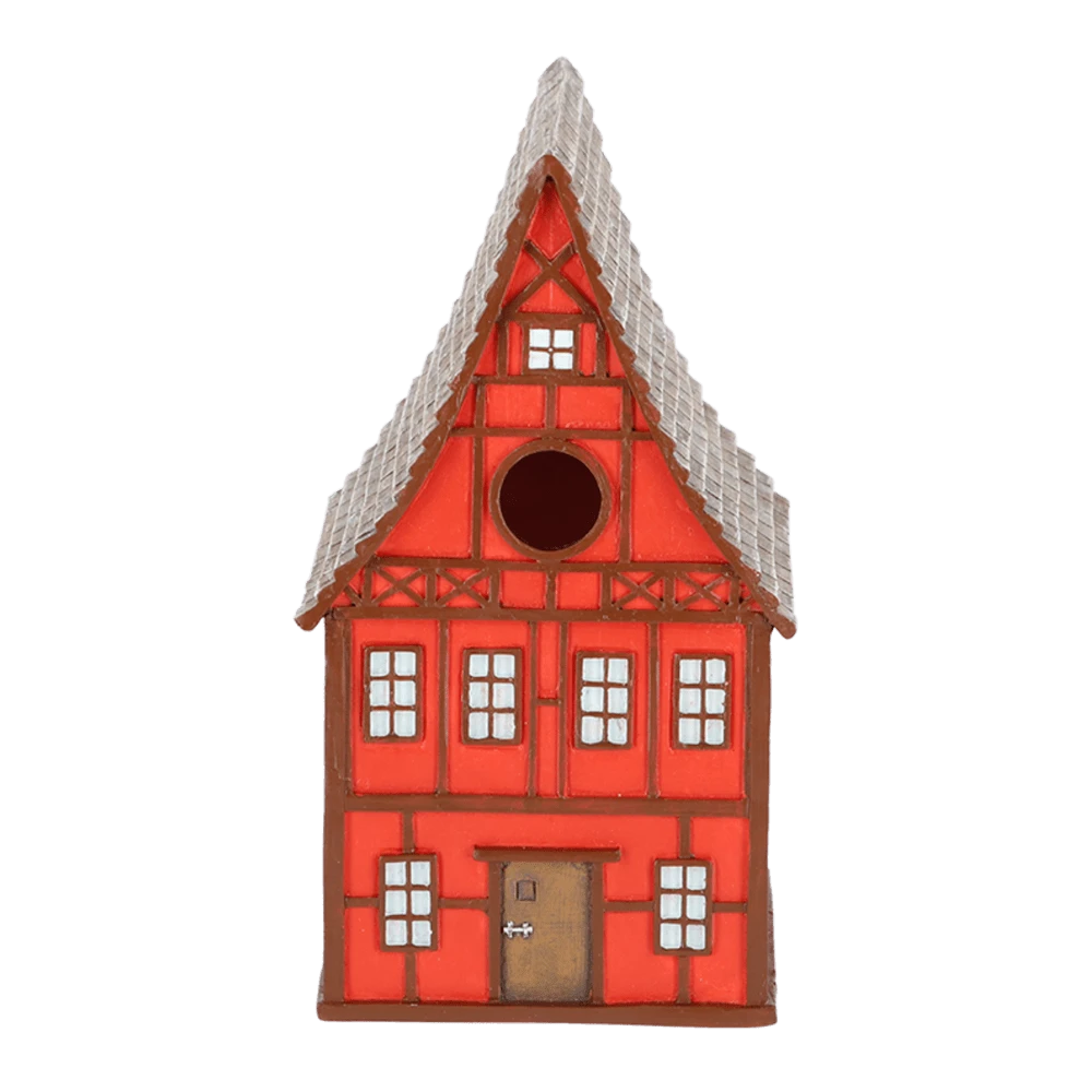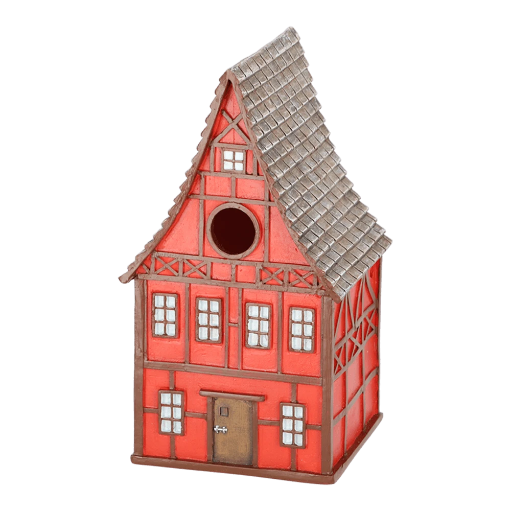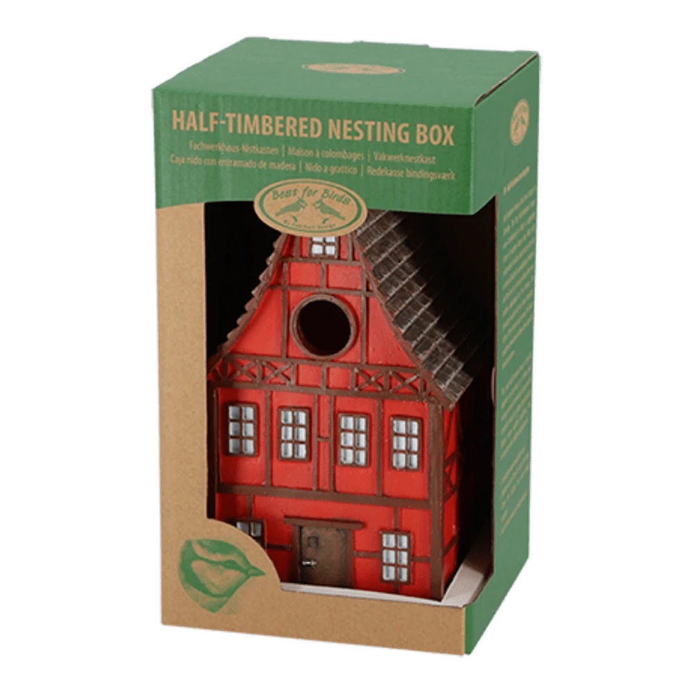 Vakwerkhuizen vinden hun historie in Duitsland. De eerste vakwerkhuizen waren boerderijen waarbij een dragend skelet van houten balken werd opgevuld met vlechtwerk van tenen van wilg, eik of hazelaar en met leem of mortel. Behalve de beschikbaarheid van materiaal en de lage kosten van het bouwen was er nog een voordeel voor de boeren. De boerenstand beschikte meestal niet over erfelijke rechten; moest de boer verhuizen kon het huis binnen enkele dagen worden afgebroken en ergens anders weer worden opgebouwd.Dit kleine vakwerkhuis is ontworpen voor de pimpelmees. Het biedt niet alleen de pimpelmees, maar ook de kuifmees, glanskop, matkop en zwarte mees een goede plek om te nestelen. Tijdens slechte weersomstandigheden biedt de nestkast beschutting en bescherming.