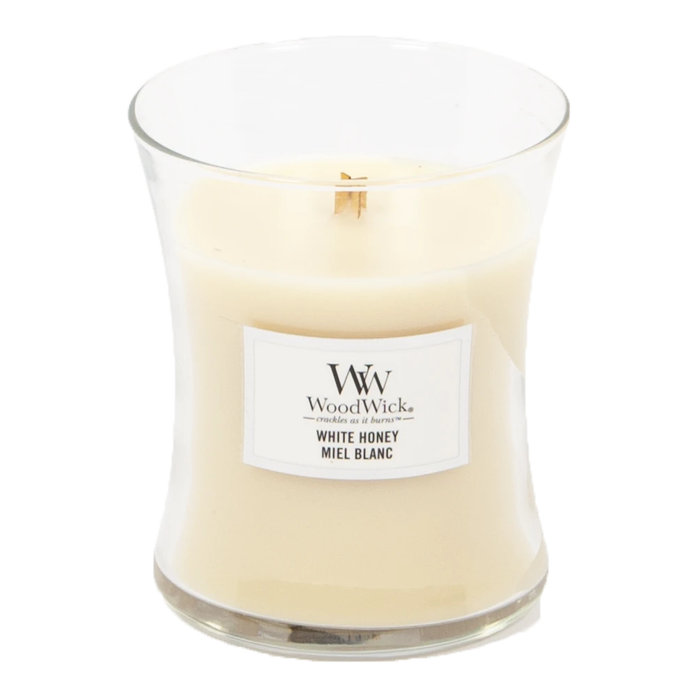 Details van de Woodwick White Honey geurkaars: