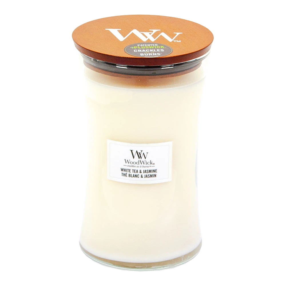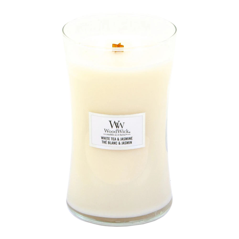 Details van de Woodwick White Tea Jasmine geurkaars:
